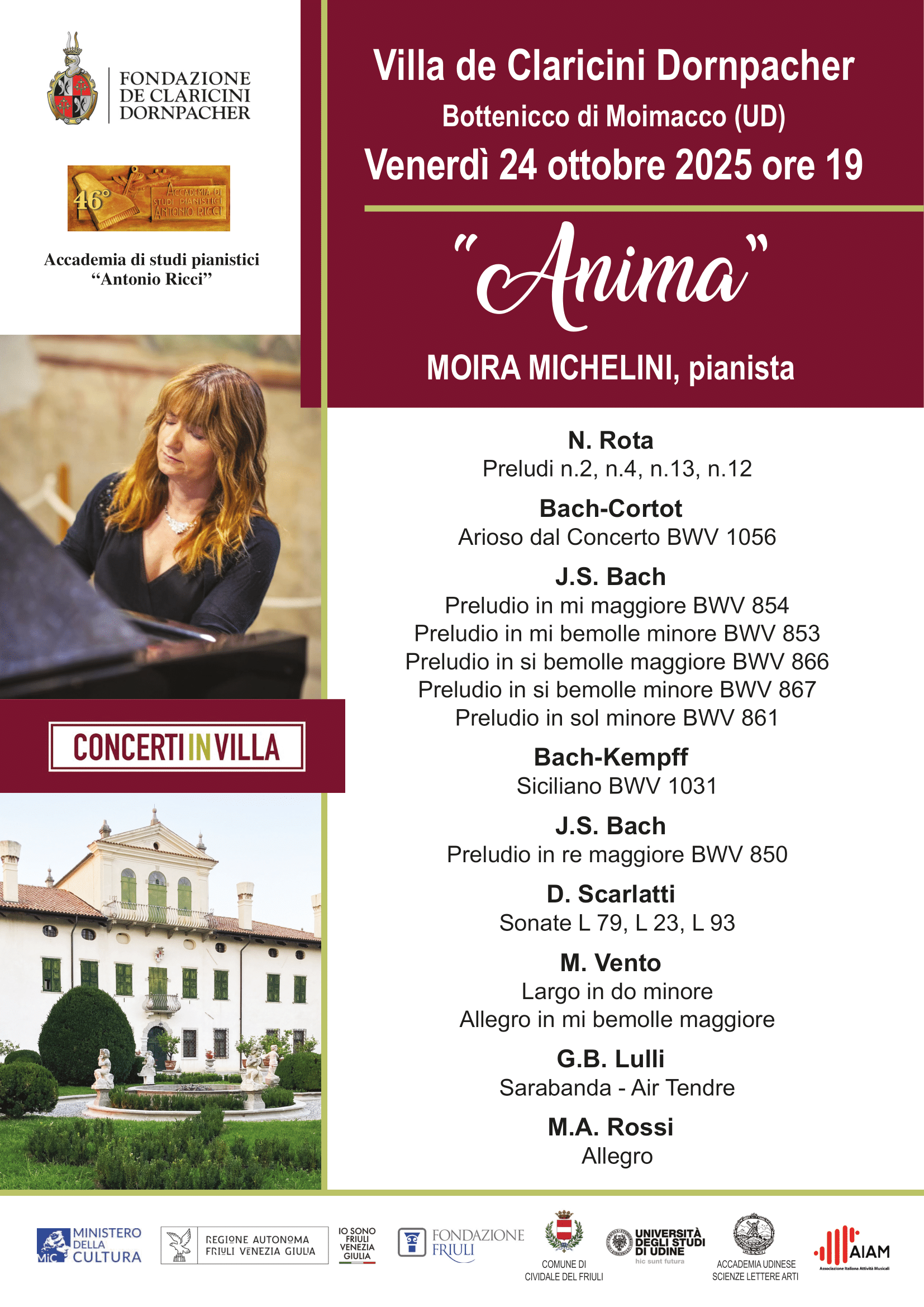 Nell’ambito della rassegna “Concerti in Villa” il salone centrale della Villa storica ospiterà il concerto “Anima” della pianista Moira Michelini. Tale iniziativa, organizzata in collaborazione con l’Accademia “Antonio Ricci” di Udine, è programmata per